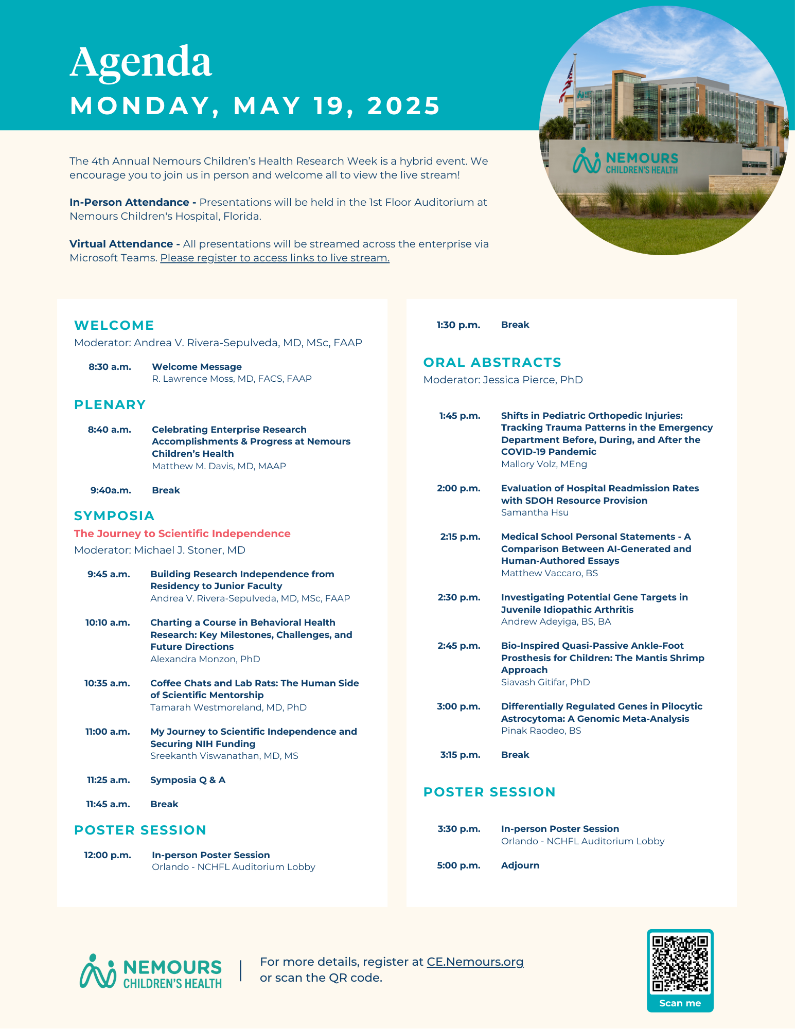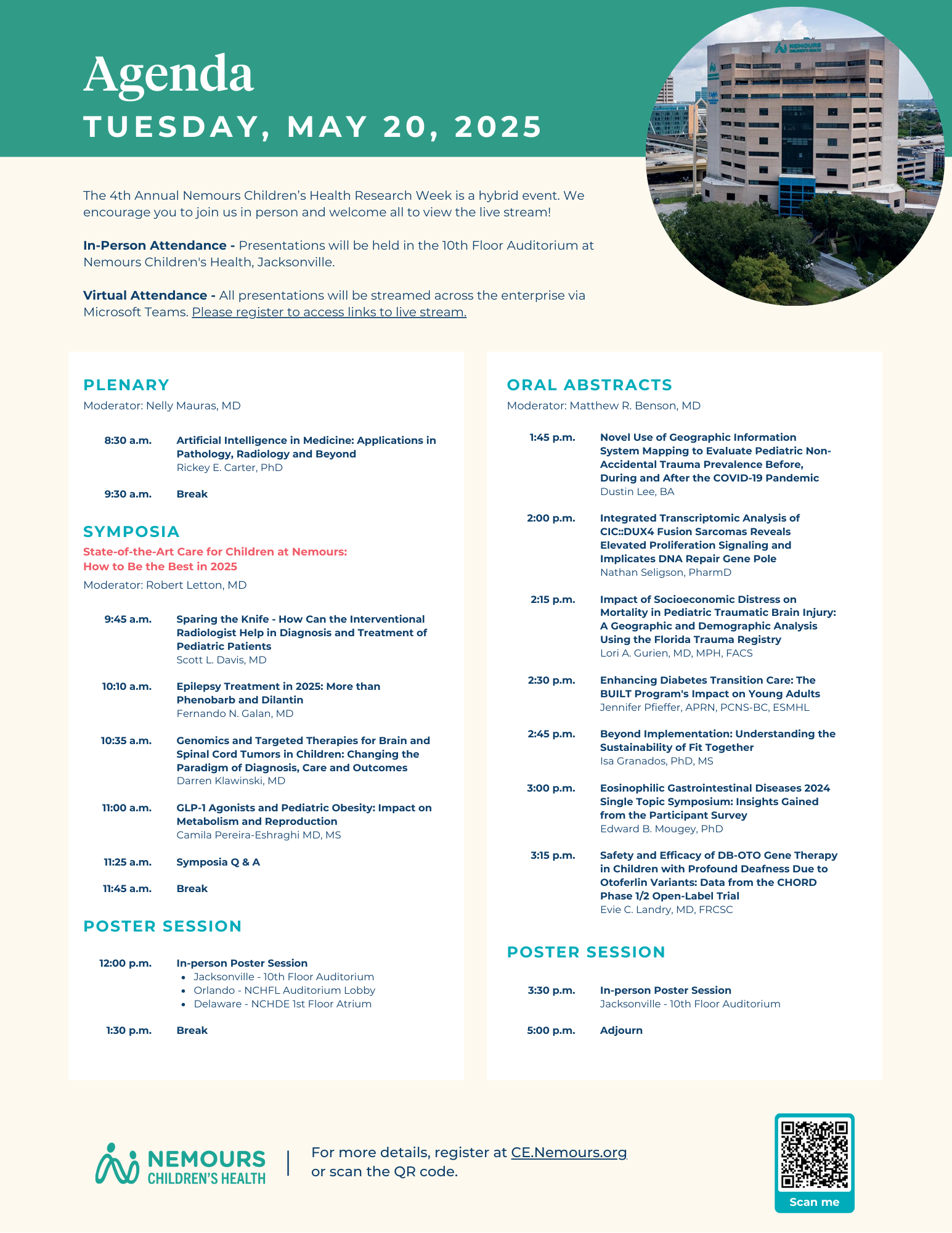 In-person programming will be held in the 1st Floor Auditorium at Nemours Children's Hospital, Florida.