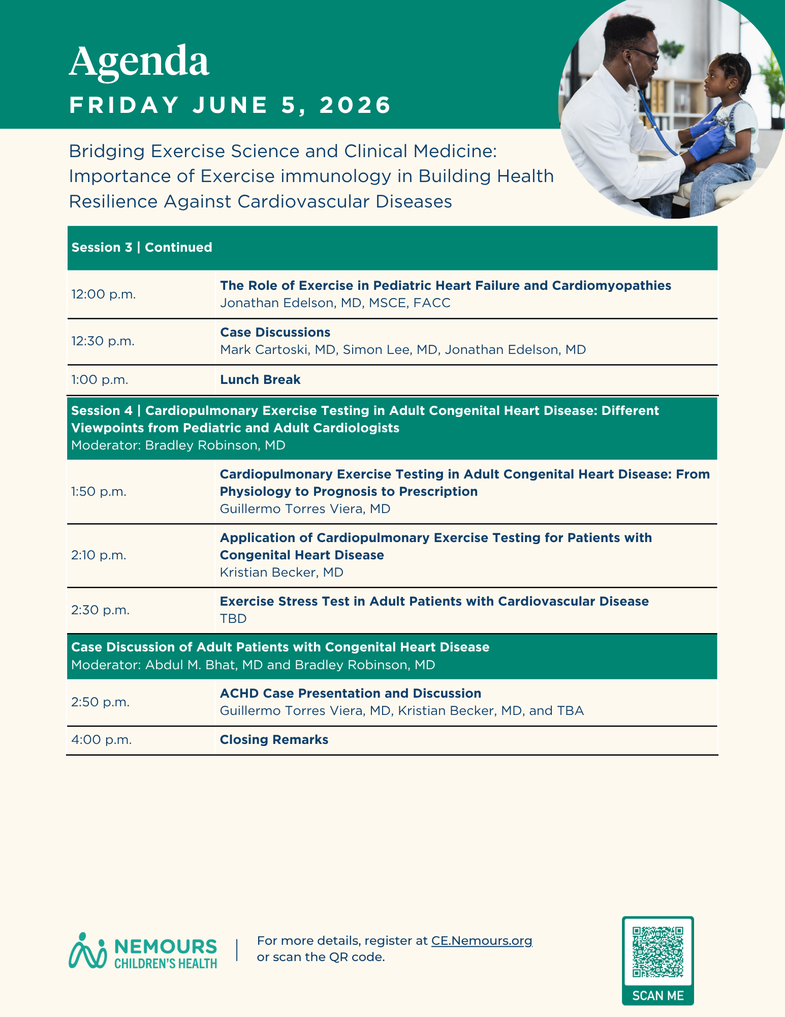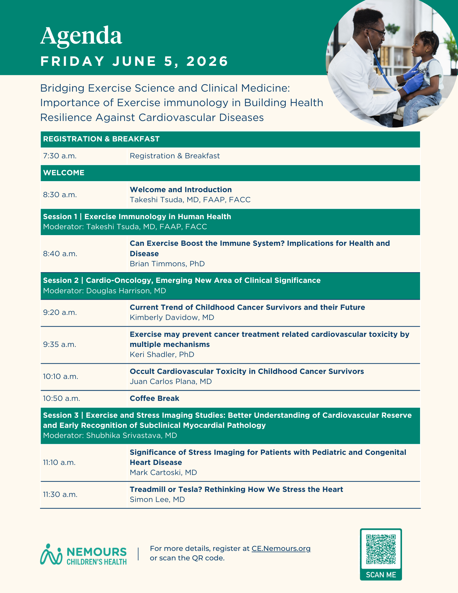 We are excited to announce the second Nemours Exercise Symposium scheduled on June 5, 2026 (Friday). This year, we will focus on how exercise helps us build up our health resilience, especially in cardiovascular health. Exercise has been known to be beneficial for human health since ancient Greece, but now more and more newly emerging science supports this historical concept. Regular exercise boosts the immune system, which has been known to play an essential role in enhancing the physical integrity of humans with and without heart disease. In addition, exercise is an important diagnostic modality not only to assess functional reserve of the cardiovascular system but also to uncover subclinical cardiovascular pathology that may not be detected by standard laboratory tests at rest. Exercise provides a new “field” where multiple medical subspecialties can meet together for better understanding of human health and disease. Exercise will introduce us to move into a new paradigm of future cardiovascular medicine.