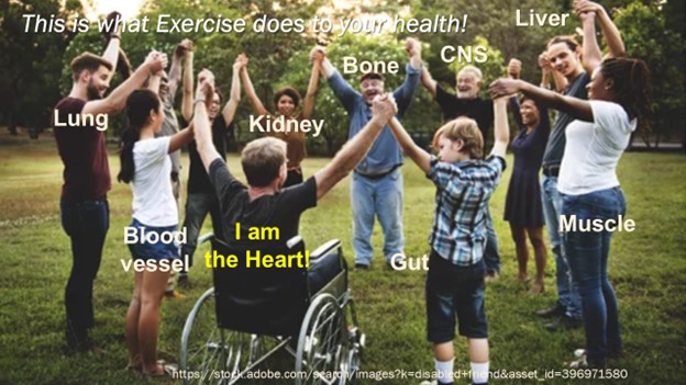 • Exercising is good for all organs in your body. Your heart supports other organs by providing nutrients and oxygen, and with exercising, these organs also give back and support the heart via biological crosstalk.  These beneficial multi-directional conversations can be enhanced by exercising routinely in daily life.