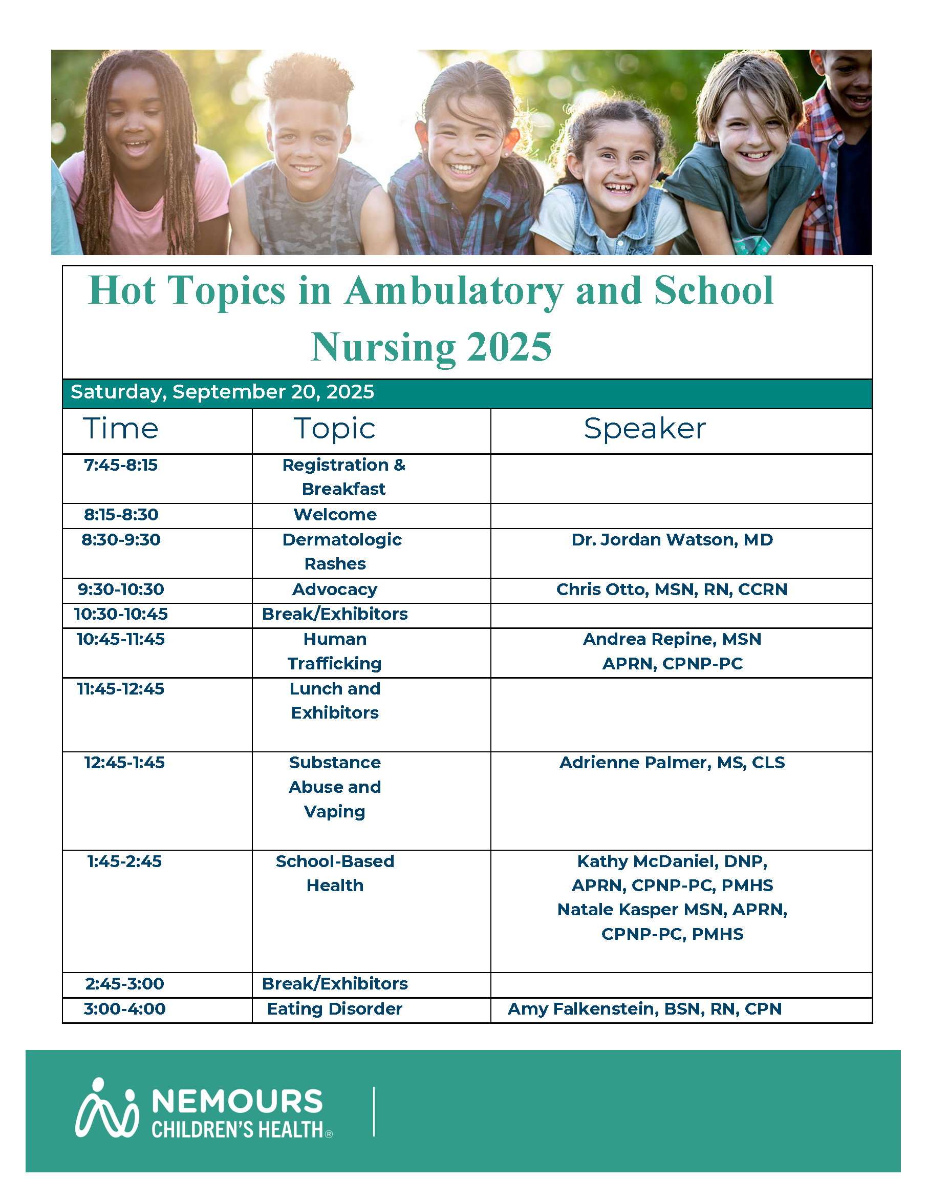 Join us for a full day of cutting-edge discussions, education, and networking at the Hot Topics in Ambulatory and School Nursing Conference. This event is designed for nursing professionals and school health staff who are passionate about advancing pediatric care in ambulatory and educational settings.