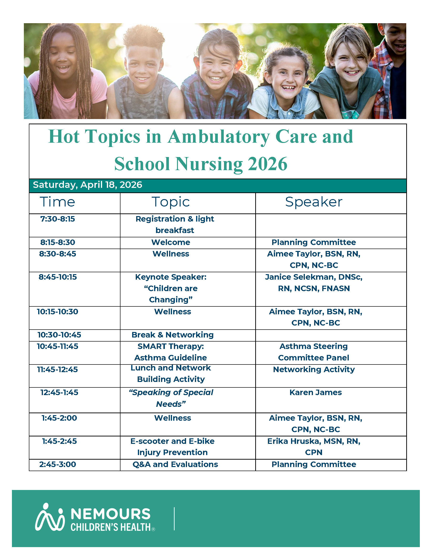 Join us for a full day of cutting-edge discussions, education, and networking at the Hot Topics in Ambulatory and School Nursing Conference. This event is designed for nursing professionals and school health staff who are passionate about advancing pediatric care in ambulatory and educational settings.
