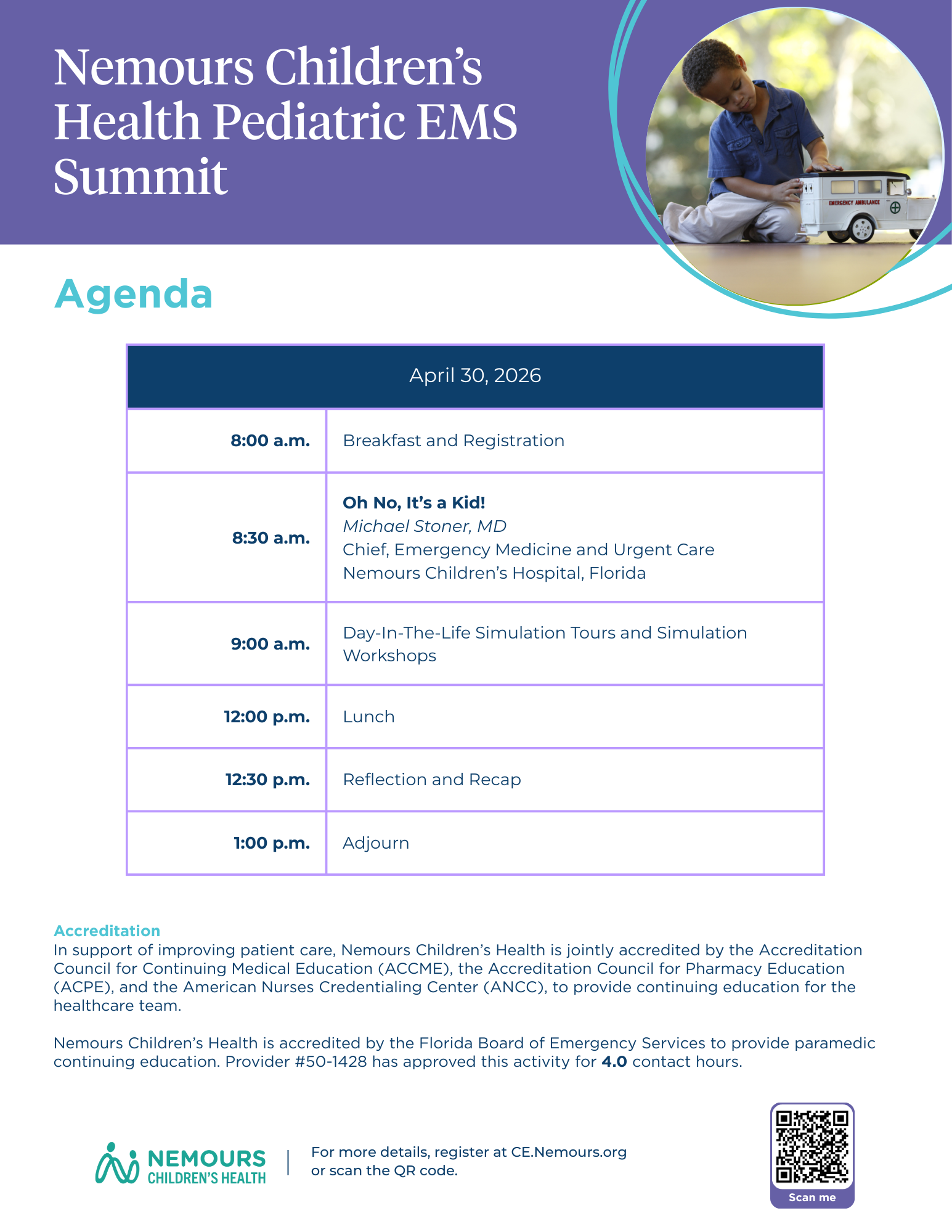 Nemours Children’s Health is accredited by the Florida Board of Emergency Services to provide paramedic continuing education. Provider #50-1428 has approved this activity for 4.0 contact hours.