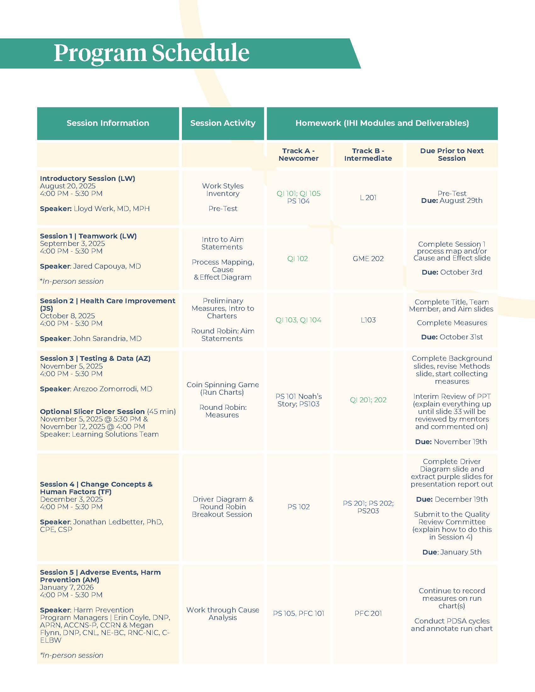 Interdisciplinary teams participate in a 10-month program for training in Quality Improvement and Patient Safety. In addition to individuals earning an IHI Basic Certificate in Quality and Patient Safety, each team will complete a team quality improvement project facilitated by their mentor. Participants will complete online modules from IHI in our flipped classroom and meet monthly to expand on their learnings.