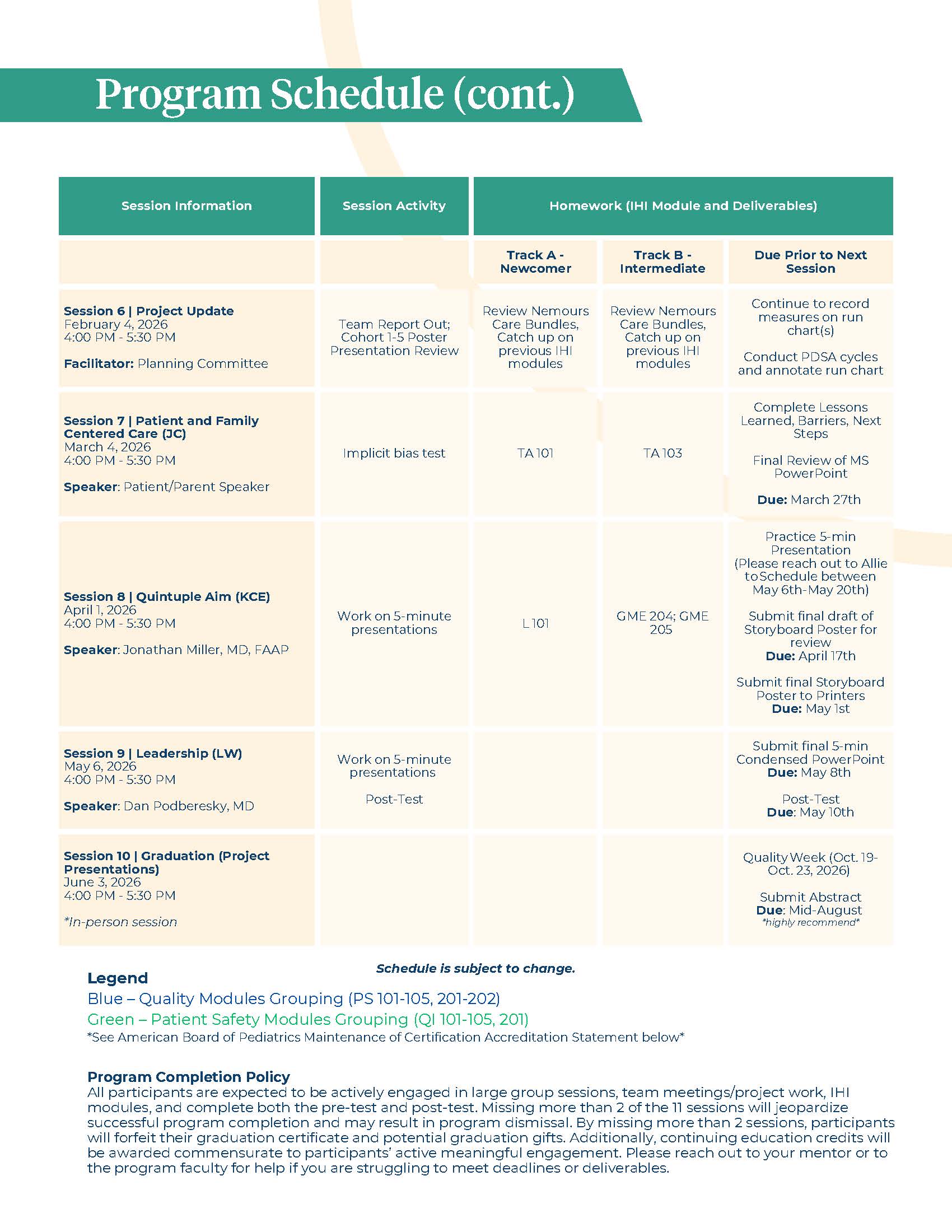 - Graduates will disseminate learnings and lead future quality improvement activities