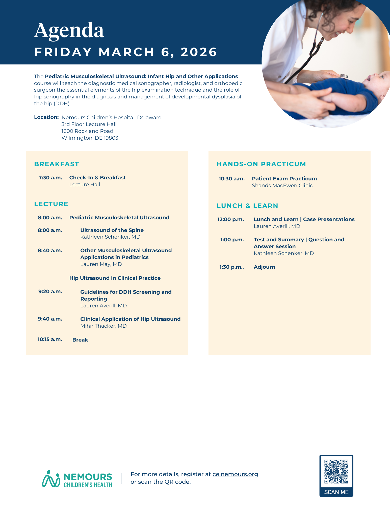 Infant hip ultrasound has been established as a highly sensitive and specific imaging modality when accurately performed by properly trained examiners. This course will teach the diagnostic medical sonographer, radiologist, and orthopedic surgeon the essential elements of the hip examination technique and the role of hip sonography in the diagnosis and management of developmental dysplasia of the hip (DDH).