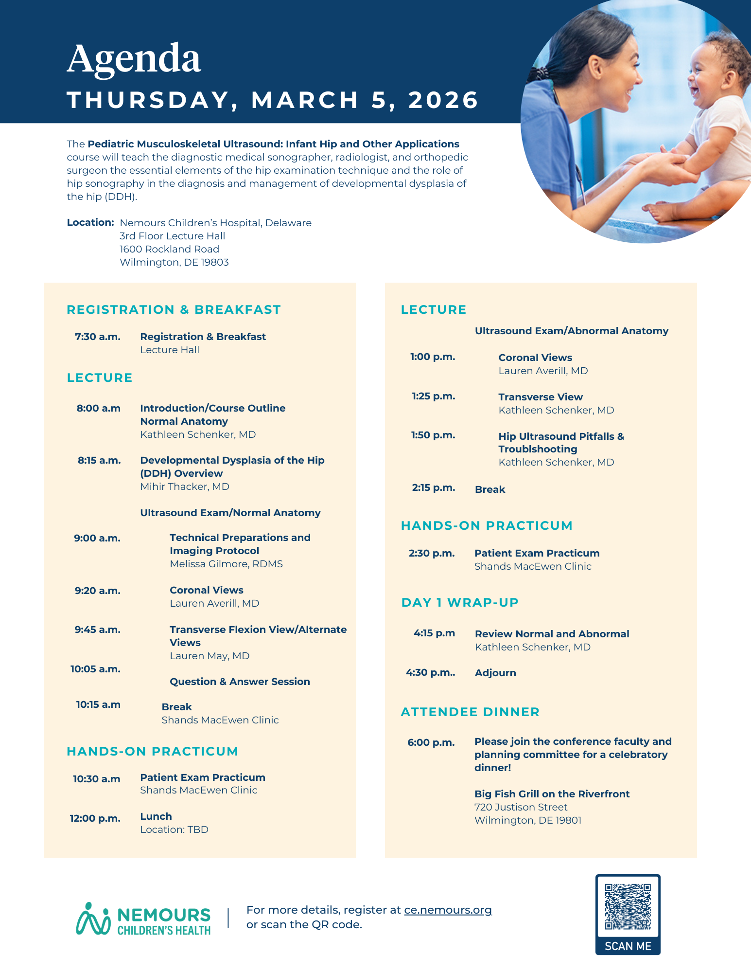 This course includes approximately five hours of clinical scanning. Under the supervision of experienced faculty, participants will have the opportunity for hands-on experience performing infant hip and spine studies in our orthopedic clinic. Other musculoskeletal applications, including the infant spine, will be discussed. This course is limited to 20 participants.